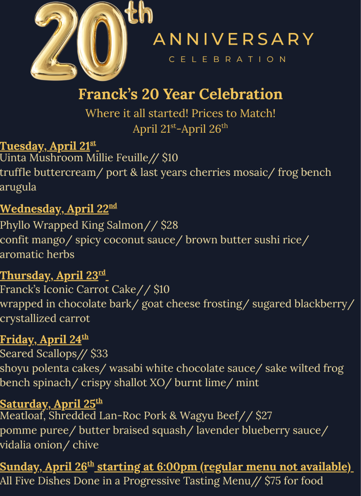 Franck’s is where world class service and a friendly atmosphere are met with calculated flavor combinations and the freshest ingredients. Every night brings a dining experience that your taste buds will dance for even the most educated of palates. The Menu is presented with an approachable selection of flavors that bring depth and complexity to your dining experience. An approach to flavor that will surprise and delight palates of every type.